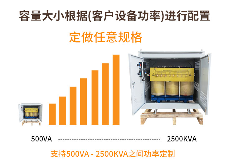变压器容量从100VA到2000KVA之间,符合 国家标准,绕组采用脱胎整列绕制方法;变压器进行真空浸漆,