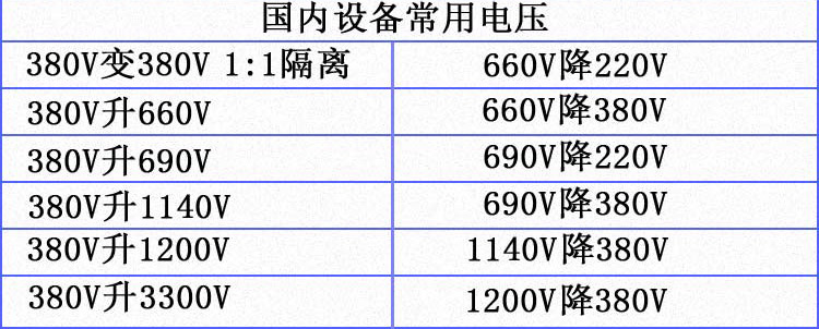 广泛用于国外重要设备、精密机床、机械电子设备、医疗 设备、整流装置,照明等。产品的各种输入、输出电压的高低、联接组别、调节抽头的多少及位置(一般为±5%)、绕组容量的分配、次级单相绕组的配备、整流 电路的运用、是否要求带外壳等,均可根据用户的要求进行精心的设计与制造。