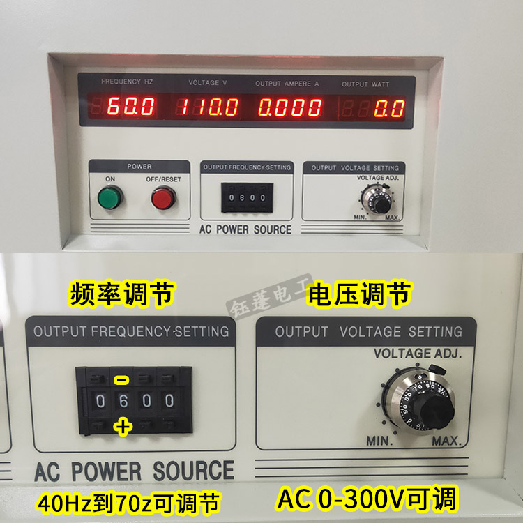 单进单出:输入:220V50HZ, 输出:60HZ 0-300V可调,频率40HZ到70HZ可调